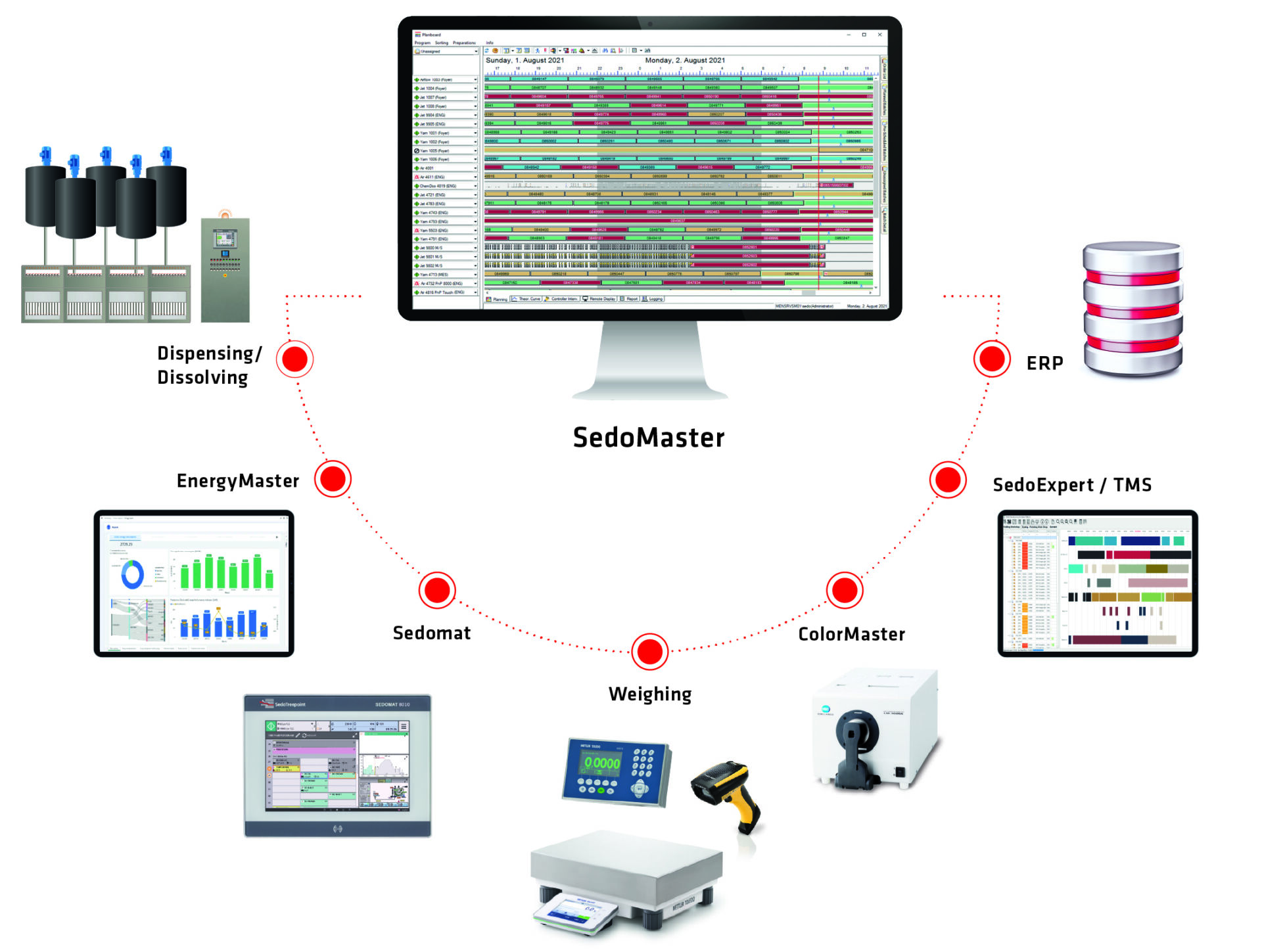 SedoMaster unterstützt Schnittstellen zu anderen Systemen, wie z. B. zu Dosierstationen, einer Rezepturverwaltung und einem ERP-System. Dadurch werden effizientere Prozesse sowie ein optimierter Maschinenpark und somit minimierte Kosten im Bereich Produktion ermöglicht.