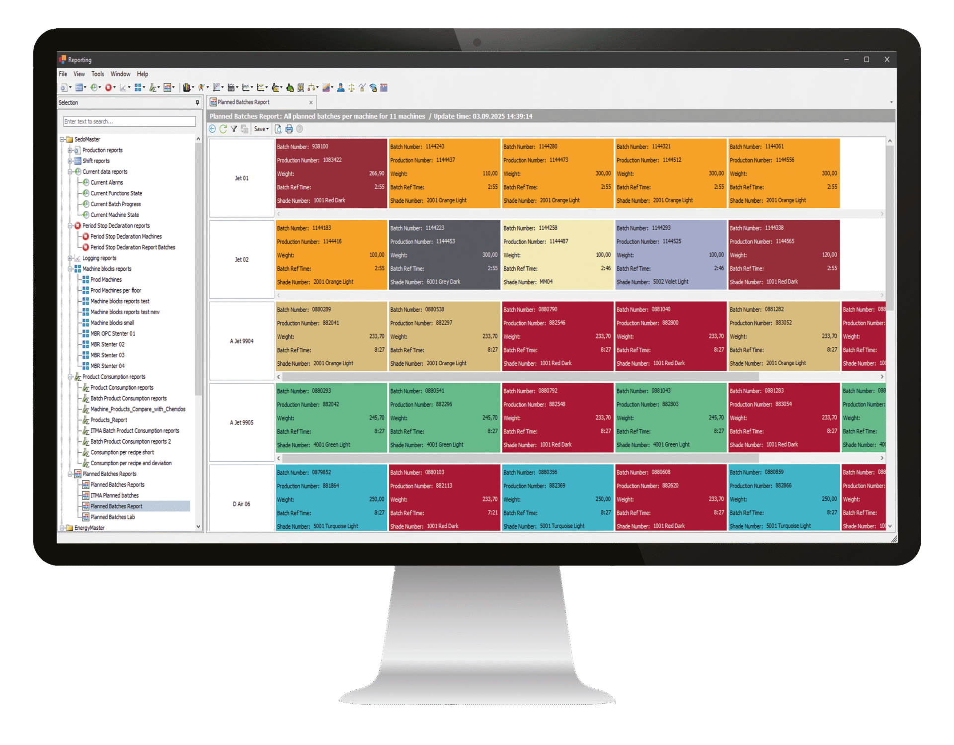 Der SedoMaster Reporting Explorer ist ein leistungsstarkes Reporting-Tool zur Erstellung von Produktionsberichten sowie von Aktuelle-Daten-Berichten, Maschinenblöcken, Geplante-Partien-Reports, Produktverbrauchsberichten (Farbstoffe / Chemikalien) und mehr.